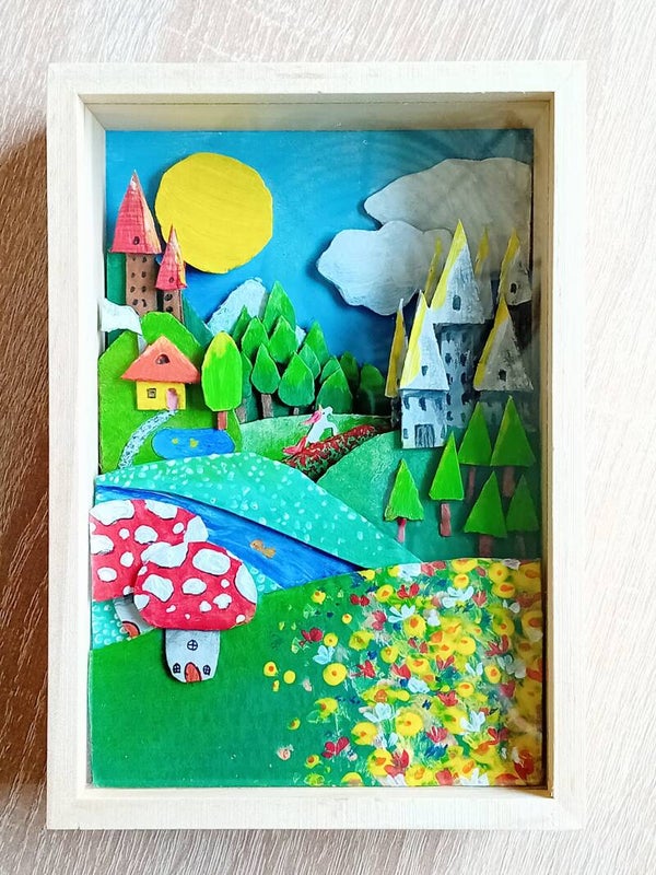 Dit magische 3D-lijstje neemt je mee naar een betoverde wereld met kleurrijke huisjes op glooiende heuvels en een schitterende eenhoorn die wacht op nieuwe avonturen.