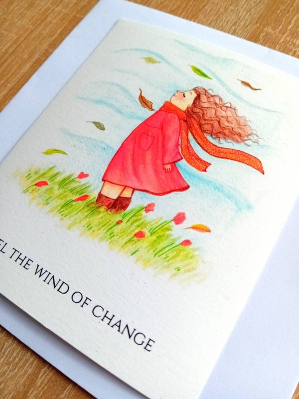 Een vrouw, ogen gesloten, de wind in haar haren – een moment vol vrijheid en verwachting. De tekst "Feel the wind of change" maakt deze postkaart een krachtig symbool voor nieuwe stappen, loslaten en vertrouwen op wat komt. Perfect om te sturen aan iemand die voor een nieuw begin staat, of zelf op zoek is naar een frisse wind. Licht, hoopvol en vol beweging.